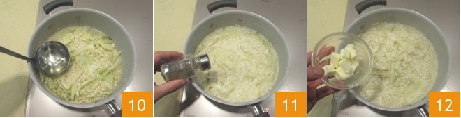 antes de añadir el primer cucharón de caldo 10. A medida que el caldo se absorbe, añade más, continuando así hasta llevar el arroz a cocción (el tiempo podrá variar según el arroz utilizado, pero tardará unos 15-20 minutos). Durante los últimos minutos de cocción ajusta la sal y la pimienta 11. Cuando el arroz alcanza el grado de cocción justo, apaga el fuego y manteca con 30 g de mantequilla 12