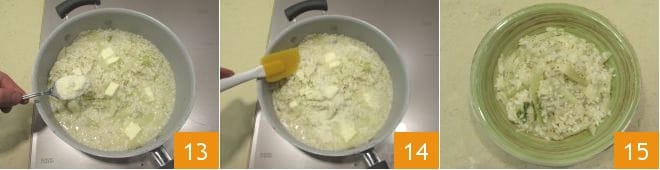 y sazona con el queso 13. Mezcla con cuidado 14 y deja reposar durante 1 minuto antes de emplatar: tu risotto con hinojo... perdón, risi coi fenoci está servido 15!