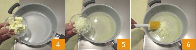 Pon entonces la mantequilla en una cacerola de fondo grueso a fuego lento 4; apenas la mantequilla se haya derretido, añade el picado de cebolla 5 y rehógala, siempre a fuego lento, durante unos minutos 6 para que se ablande sin tomar color.