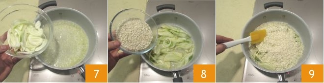 Añade ahora los hinojos cortados finos 7, sube un poco el fuego y deja que se sazonen los hinojos durante unos 5 minutos, girándolos para que la cocción sea uniforme. Añade el arroz 8 y, siempre removiendo, deja que se sazone durante 3-4 minutos 9