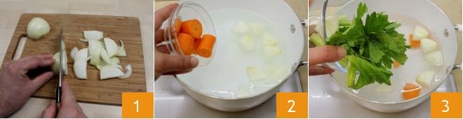 Para preparar el risotto de calabaza con robiola y panceta crujiente, empieza a preparar el Caldo de verduras En una olla grande pon a hervir el agua; mientras tanto, lava bien todas las verduras. Pela una cebolla y córtala en trozos 1, luego pela una zanahoria, quitándole los extremos y córtala groseramente 2 junto con el apio. Vierte todas las verduras 3, ajusta de sal y, cuando el agua haya alcanzado el punto de ebullición, cierra con una tapa. Cocina durante unos treinta minutos y al final de la cocción filtra el caldo con un colador.