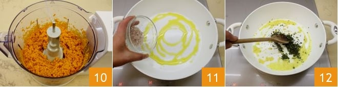 Tritura la calabaza hasta obtener una consistencia muy fina 10 y posteriormente prepara el sofrito; en una amplia olla antiadherente haz dorar el chalote picado finamente con un chorrito de aceite 11, añade el picado de hierbas aromáticas que habías preparado y deja cocinar durante 15 minutos a fuego muy bajo, añadiendo un poco de caldo 12.