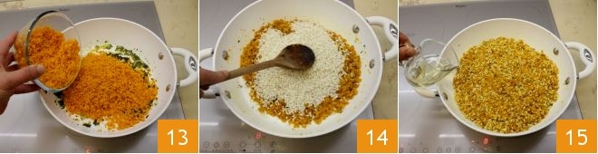 Cuando el chalote esté bien dorado, añade la calabaza triturada 13; ajusta de sal a tu gusto y añade el arroz 14, mezclando bien con una cuchara de madera durante unos minutos para evitar que se pegue a la cazuela. Haz tostar el arroz y rocía con el vino blanco 15.