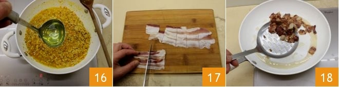 Deja cocinar durante al menos 20 minutos y, durante la cocción, añade 1-2 cucharones de caldo de verduras, cada vez que el anterior se haya secado 16. Unos minutos antes del final de la cocción del risotto procede a preparar el condimento: corta en cubos la robiola y déjala aparte, luego toma la panceta, córtala en tiras finas y luego en cuadraditos 17; hazla dorar a fuego medio en una sartén antiadherente hasta que se vuelva crujiente y dorada 18.