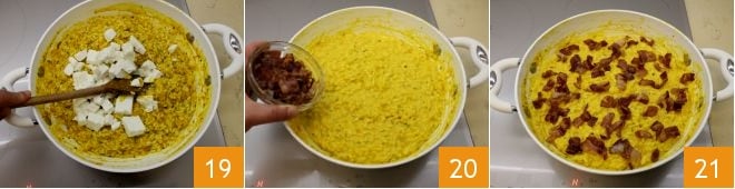 Cuando el risotto esté listo, apaga el fuego y haz mantecar añadiendo la robiola cortada en cubos 19; mezcla bien y termina añadiendo también la panceta crujiente 20. Deja reposar dos minutos y sirve el risotto de calabaza con robiola y panceta crujiente bien caliente 21.