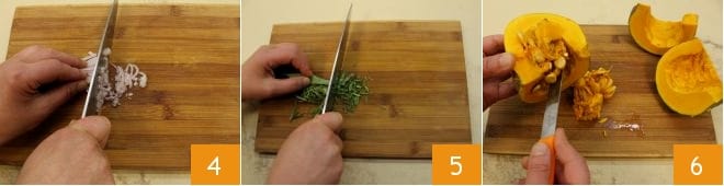 Mientras tanto, con un cuchillo pica finamente el chalote 4, la salvia y el romero 5 y déjalo aparte. Ahora pasa a limpiar la calabaza: con un cuchillo divídela a la mitad y luego en rodajas, después limpia bien el interior vaciándolo de las semillas y los filamentos 6.
