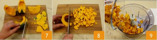 Después de haber eliminado la piel 7, corta la pulpa en dados de aproximadamente 2 cm 8 y coloca los cubos de calabaza que has obtenido en una batidora 9.