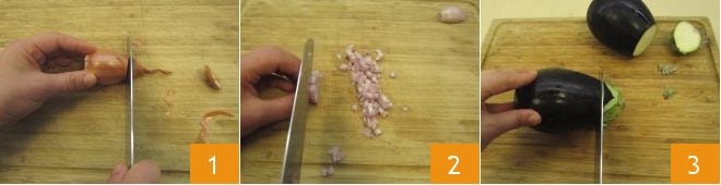 Para preparar el risotto con berenjenas, comienza preparando el Caldo de verduras para usarlo caliente. Como alternativa, puedes usar agua, pero con el caldo vegetal, el risotto será más sabroso. Luego pasa a la preparación del sofrito: pela el chalote 1, pícalo con un cuchillo 2 y déjalo un momento a un lado. Le toca a las berenjenas: después de lavarlas, quítales los extremos 3