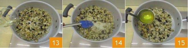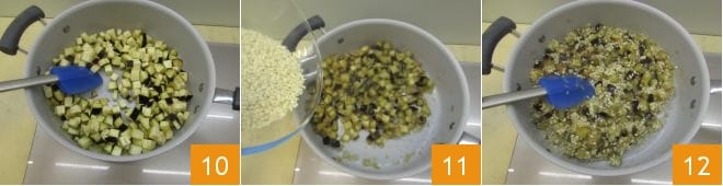 remueve 10, y deja cocer durante unos 4 minutos, siempre a fuego bajo. Luego añade el arroz 11, removiendo bien para tostarlo junto con las berenjenas 12.