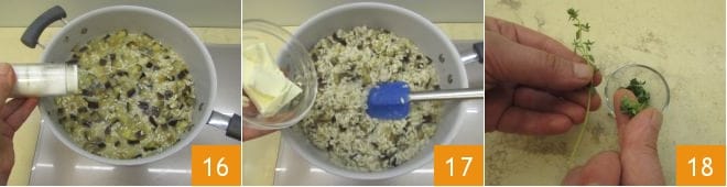 Cuando el arroz esté cocido, añade una pizca de sal 16: ten cuidado de no añadir demasiado, ya que el caldo ya es salado. Ahora puedes apagar el fuego y añadir la mantequilla 17, dejándola derretir mientras mezclas durante unos minutos. Mientras tanto, quita las hojas de las ramitas de tomillo 18