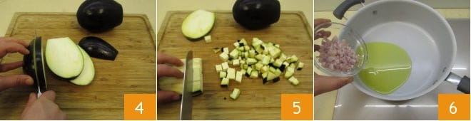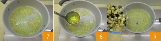 Sofríe el chalote a fuego lento durante 4-5 minutos, 7 removiendo de vez en cuando para que no se pegue. Luego rocía con un cucharón de caldo caliente 8 y deja cocer tu sofrito durante 10 minutos más. Pasado este tiempo, añade las berenjenas en cubos 9