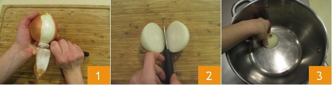 Para preparar el risotto con cítricos comience preparando el caldo. Limpie la cebolla 1 y córtela por la mitad 2. Colóquela al fuego en una cacerola bastante grande con el corte hacia abajo 3.