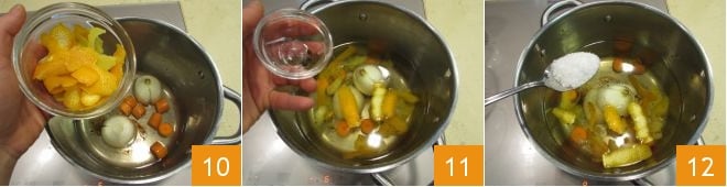 las cáscaras de naranja y de limón 10. Agregue también los granos de pimienta negra 11 y una cucharada de sal gruesa 12.