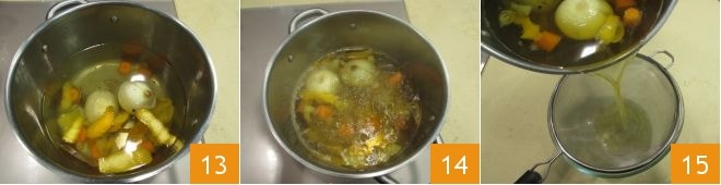 Lleve a ebullición 13 y deje cocinar durante aproximadamente una hora 14. Luego filtre todo 15 y mantenga el caldo caliente.