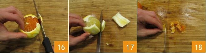 En este punto, retome el limón y la naranja a los que les ha quitado la piel y pélalos en vivo (16-17), prestando atención a eliminar completamente la parte blanca. Luego corte la naranja primero en rodajas y luego en dados tratando de no perder los jugos 18.