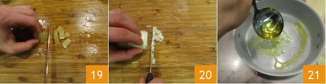 Repita la misma operación también para el limón, de modo que obtenga cubos del mismo tamaño. Pique finamente la cebolla 19 y déjela dorar en una cacerola junto con el aceite, añadiendo un cucharón de caldo para estofarla suavemente 21.