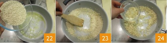 Solo cuando el caldo se haya evaporado y la cebolla esté bien pochada, agregue el arroz 22. Tuéstelo a fuego medio-bajo durante unos 2 minutos, mezclando a menudo 23, luego desglase con el vino blanco 24.