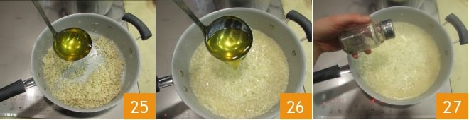 Tan pronto como el alcohol se haya evaporado, vierta un cucharón de caldo 25 y continúe la cocción durante unos 15-18 minutos, añadiendo más según sea necesario 26 y mezclando. Para los tiempos de cocción recomendamos seguir las indicaciones en el paquete del risotto. Cuando falten 2-3 minutos y el arroz esté casi cocido, ajuste la sal y la pimienta 27.