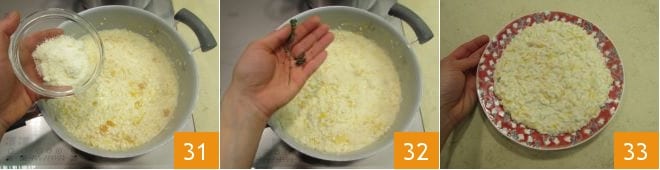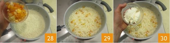 Agregue también los dados de cítricos 28 y mezcle para amalgamar todo 29; no se preocupe si los dados de cítricos no permanecen íntegros y se desmoronan ligeramente. Tan pronto como esté cocido a la perfección, apague el fuego y agregue el mascarpone 30.