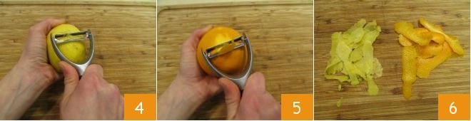 Mientras tanto, utilizando un pelador de patatas, saque la cáscara de la naranja 4 y del limón 5, teniendo cuidado de no llevarse también la parte blanca que resultaría amarga. Asegúrese de obtener trozos de cáscara bastante grandes 6.