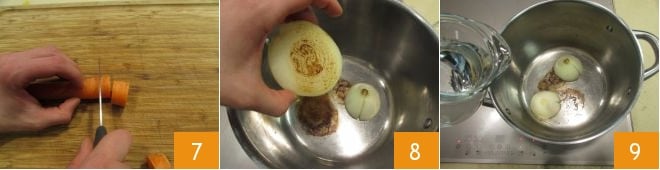 Pase a la zanahoria, córtela en trozos sin pelarla, pero teniendo cuidado de lavarla bien 7. Tan pronto como la cebolla esté bien dorada 8, agregue en la misma cacerola también el agua 9, las zanahorias