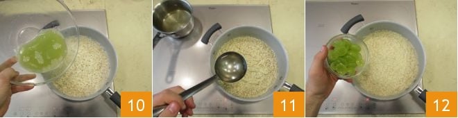 Dejadlo tostar durante unos minutos: tan pronto como los granos estén transparentes, podréis desglasar con el jugo de uva 10. Una vez evaporado, añadid el caldo vegetal caliente y ya salado a cucharones hasta terminar la cocción. Recordad no remover demasiado el arroz 11. Al final de la cocción, apagad el fuego y mantecad el risotto añadiendo las uvas sin semillas y cortadas algunas por la mitad y otras en cuartos 12,