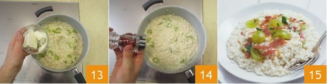 luego la robiola, una pizca de pimienta rosa y mezclad bien 14. Emplated y luego decorad cada plato con un poco de jamón crudo desmenuzado a mano y perejil picado. ¡Vuestro risotto con uvas está listo, buen provecho!