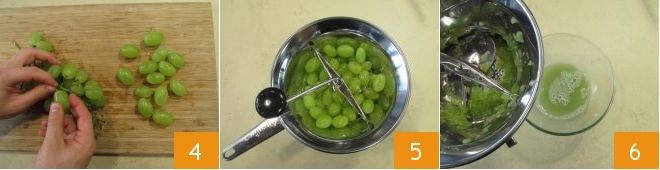 Continuad enjuagando las uvas, luego separad las uvas 4 y vertedlas en un pasapuré 5; recordad reservar algunas para la decoración. Las demás pasadlas para obtener el jugo y ponedlo a un lado 6.