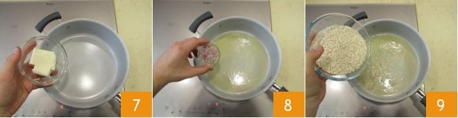 Poned a derretir la mantequilla en una cazuela grande a fuego muy bajo 7 y luego añadid la chalota picada dejándola pochar durante unos diez minutos 8. Removad con frecuencia en esta fase. Si se seca demasiado rápido, añadid unas cucharadas de caldo caliente. Transcurrido el tiempo, subid un poco el fuego y verted el arroz 9.