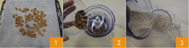 Para preparar los roccocò, comenzad tostando las almendras con piel. Simplemente dispónganlas en una bandeja y pásenlas al horno precalentado a 180° durante 5 minutos 1. Una vez tostadas, sáquenlas del horno, dejad que se enfríen un poco y luego vertan 50 gramos en una batidora 2 y mezclen hasta obtener una mezcla suficientemente arenosa; las otras reservenlas 3.