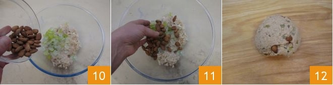Incorporen el cedro cortado en cubitos junto con 50 gramos de almendras enteras 10, mezclar también estos al compuesto y luego pásenlo todo a la superficie de trabajo 11. Continúen amasando hasta obtener un bollo liso 12.