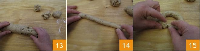 Trabajen la masa con las manos hasta obtener un rollo 13 del cual podrán obtener 11 piezas de aproximadamente 75 gramos cada una, simplemente separándolas con las manos para preservar la integridad de las almendras enteras. De las piezas, saquen bigoli de unos 20 centímetros de largo 14, luego unan los dos extremos 15 para formar una rosquilla.