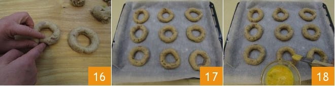 Pellizquen con los dedos los dos extremos para sellarlos, de modo que mantengan la forma durante la cocción 16. Transfieran las rosquillas a una bandeja forrada con papel de horno 17 y pincelen la superficie con huevo ligeramente batido 18. Si deciden añadir los 30 gramos de almendras opcionales para decorar la superficie, pueden hacerlo ahora, después de haber pincelado las rosquillas.