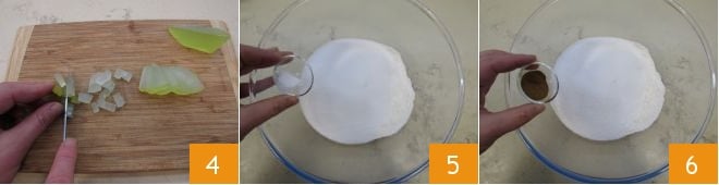 Corten el cedro confitado en cubitos 4 y dedíquense a la masa: en un bol unan la harina 00 con el azúcar y el bicarbonato (si desean respetar la receta tradicional, utilicen amoníaco alimentario en lugar del bicarbonato, en las mismas dosis) 5, luego el mix de especias indicado (o respetando la receta tradicional, el pisto) 6.