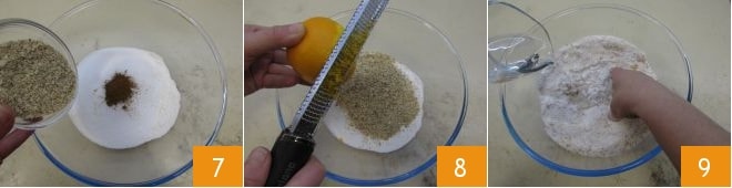 y las almendras trituradas 7. Rallen la cáscara de ¼ de naranja 8 y amasen vertiendo el agua a temperatura ambiente en forma de hilo 9 hasta obtener una masa muy compacta y seca.