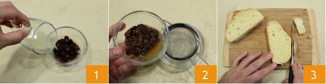 Para preparar los rollitos a beccafico con lima y jengibre, comienza lavando las pasas y poniéndolas en remojo con 25 ml de jugo de lima 1 durante al menos 10 minutos. Pasado el tiempo necesario, podrás escurrirlas conservando el líquido de remojo que se utilizará en la receta 2. Mientras tanto, quita la corteza de las rebanadas de pan 3