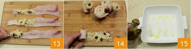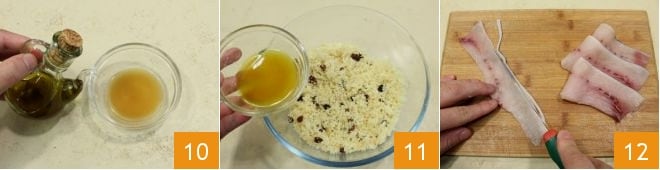 Recupera también el líquido de remojo de las pasas, añade 20 ml de aceite de oliva 10 y agrégalo al relleno 11. Toma las láminas de pez espada, puedes solicitar en la pescadería láminas de un grosor de aproximadamente 4-5 mm o puedes cortarlas tú mismo de una sola pieza utilizando un cuchillo para filetear el pescado, o alternativamente, puedes usar la cortadora. Luego, quita la piel de las rebanadas de pez espada 12
