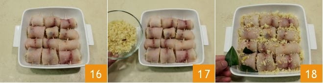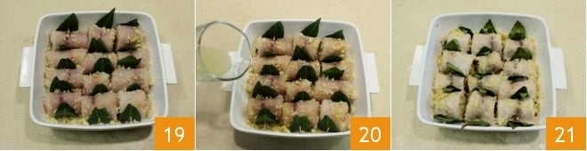 coloca los rollitos uno al lado del otro con la parte de la apertura hacia abajo 16. Esparce el relleno restante por encima 17, luego coloca las hojas de laurel entre cada rollito como si fueran pequeñas alas 18.