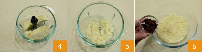 coloca la miga en una batidora 4 y tritúrala finamente 5, luego viértela en un bol y añade las pasas previamente escurridas 6.