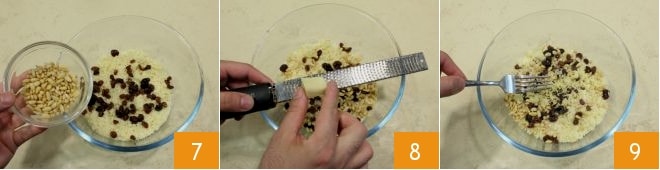 Añade también los piñones 7 y ralla el jengibre fresco 8, salpimienta al gusto y mezcla todos los ingredientes 9