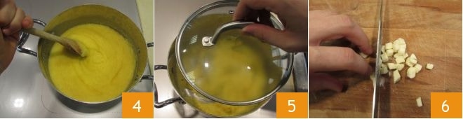 Coced a fuego bajo durante un par de minutos, continuando a mezclar para que no se formen grumos 4. Transcurrido el tiempo de cocción, la polenta debe estar suave y no demasiado espesa, apagad el fuego, cubrid con la tapa 5 y reservad la polenta. Eliminad la corteza del Taleggio y cortad el queso en dados 6.