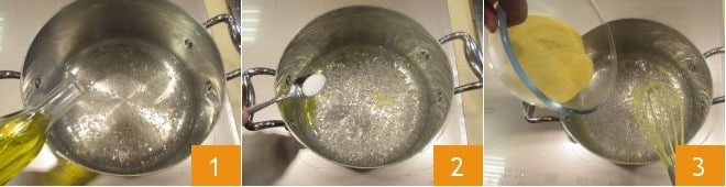 Para preparar los rollitos de polenta, llenad con agua una cacerola de borde alto y empezad a calentar a fuego bajo. Cuando el agua hierva, añadid sal 1 y alrededor de 10 g de aceite de oliva 2, luego verted en forma de lluvia la harina mezclando con la varilla 3
