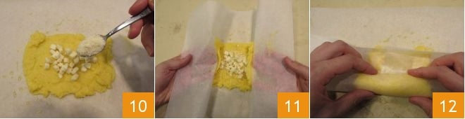 hasta obtener un cuadrado de aproximadamente 10x10 cm. Rellenad la parte central con 50 g de Taleggio cortado en cubos y Parmigiano rallado 10, finalmente espolvoread a gusto con pimienta negra. Doblad la hoja de papel de horno levantando los lados para plegar más fácilmente las partes laterales 11, luego enrollad suavemente el papel para crear un rollito 12. Proceded de la misma manera con los demás: aconsejamos hacer estas operaciones rápidamente para que no se endurezca demasiado la que queda en la cacerola.