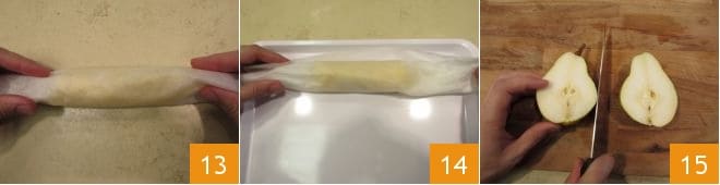 Una vez enrollados todos los rollitos 13, colócalos en una bandeja 14 y déjalos endurecer en el frigorífico durante al menos 20 minutos. Ahora prepara el condimento: lava y corta las peras por la mitad sin pelarlas 15 luego elimina las semillas y el corazón central,