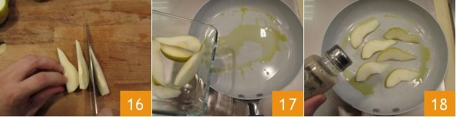 divide de nuevo en dos partes iguales cada mitad y cada cuarto en 3 gajos 16. Calienta un poco de aceite de oliva en la sartén, añade los gajos de pera 17, sala, pimienta al gusto 18