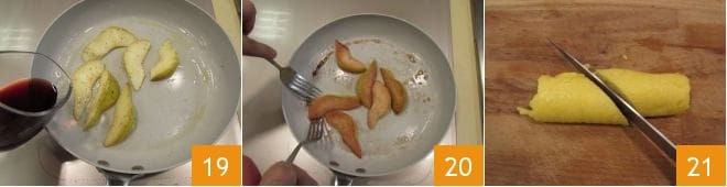 dora las peras por ambos lados y luego rocía con el vino tinto 19, deja evaporar el vino y cocina las peras por ambos lados durante 2-3 minutos, deben quedar crujientes 20. Transcurrido el tiempo de reposo, recupera los rollitos de polenta y córtalos por la mitad en diagonal 21.