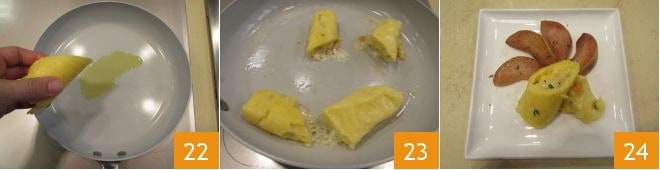 Calienta un poco de aceite de oliva en la sartén y dora durante unos 2 minutos los rollitos (22-23), deben dorarse ligeramente en la superficie y el relleno debe ser fundente. Una vez listos, sirve los rollitos de polenta con las peras al vino, perfúmalos con tomillo fresco y disfrútalos bien calientes 24!