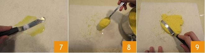 Ahora aceitad el centro de una hoja de papel de horno con una espátula 7 y verted la polenta en el punto aceitado, un par de cucharadas serán suficientes 8. Extiéndela sobre la superficie con la espátula 9,