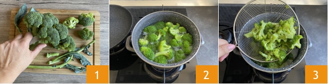 Para realizar la rosca de brócoli y salchicha, primero limpia el brócoli quitando las hojas y separando las flores del tallo 1, luego enjuágalas bajo el agua corriente y escáldalas en agua salada durante unos 3 minutos 2. Después escúrrelas y resérvalas 3.