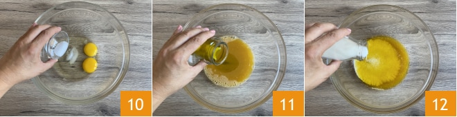 En un bol rompe los huevos, añade la sal 10 y mezcla. Vierte el aceite 11 y la leche 12 y mezcla de nuevo.